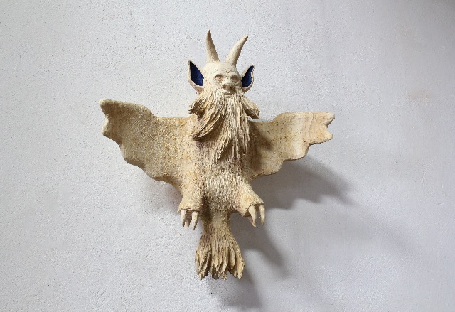 Doch stimmt das eigentlich? Egal welche der Skulpturen: Immer haben sie auch den Ausdruck bemitleidenswerter Selbstverfangenheit. Im Crossover der Versatzstücke aus grauer Vorzeit und tagesaktueller Bedrohung durch politisch-religiöse Untergrundkämpfer bekommen diese Statuen sofort auch immer etwas unbeholfen Groteskes, etwas Ulkiges. Es sind Opfer von Chimären ihrerselbst. Der eine geifert mit den Zähnen, die er zur Einschüchterung seiner Gegner ausgebildet hat und die ihm dann selbst zum fatalen Verhängnis einer Maulsperre geworden sind. Der andere eifert in einem vollkommen plumpen Ganzkörper-Umhang, mit verräterisch hervorlukendem Bart, selbst befangen in seiner Tarnung. Die Absurdität wird zur Hybris. Der Säbelzahntiger reckt uns sein Maul auch noch mit doppeltem Kopf entgegen und kann uns gerade dadurch mit seinem irrenden Blick nicht fixieren. Und was sollen diese "mutmaßlichen Terroristen", die die Arme unbeweglich, rechtwinklig am Kölrper halten, denn wirklich in Schach halten? Wohin geht es, wenn sie die Wand empor krauchen wie Maden, oder in der kompakten Form von Quallen an ihr hochschweben, so gefährlich etwa wie aufsteigende Engelchen? Ironie ist zweifellos im Spiel, das beweisen nicht erst die Titel, wie beispielsweise "Drei Helden und ein Luschi".